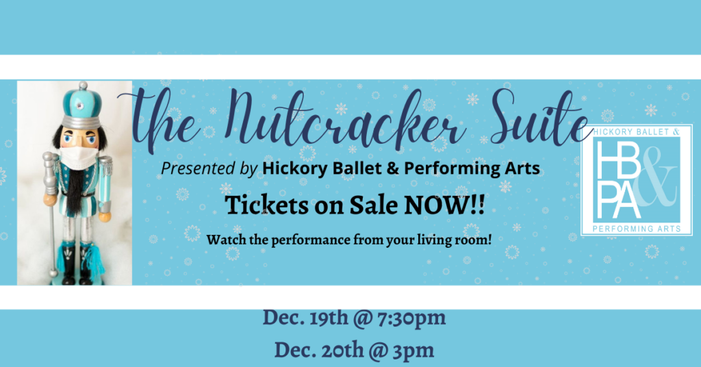 Join Clara and the Nutcracker as Hickory Ballet & Performing Arts presents a holiday favorite, The Nutcracker Suite, live-streamed to enjoy from the comfort of your home! Our favorite moments from The Nutcracker will be danced by Hickory’s own pre-professional youth ballet company, creating entertainment for all ages as you celebrate the season. Don’t miss out on this wonderful opportunity to support our youth, and enjoy one of our most cherished traditions!