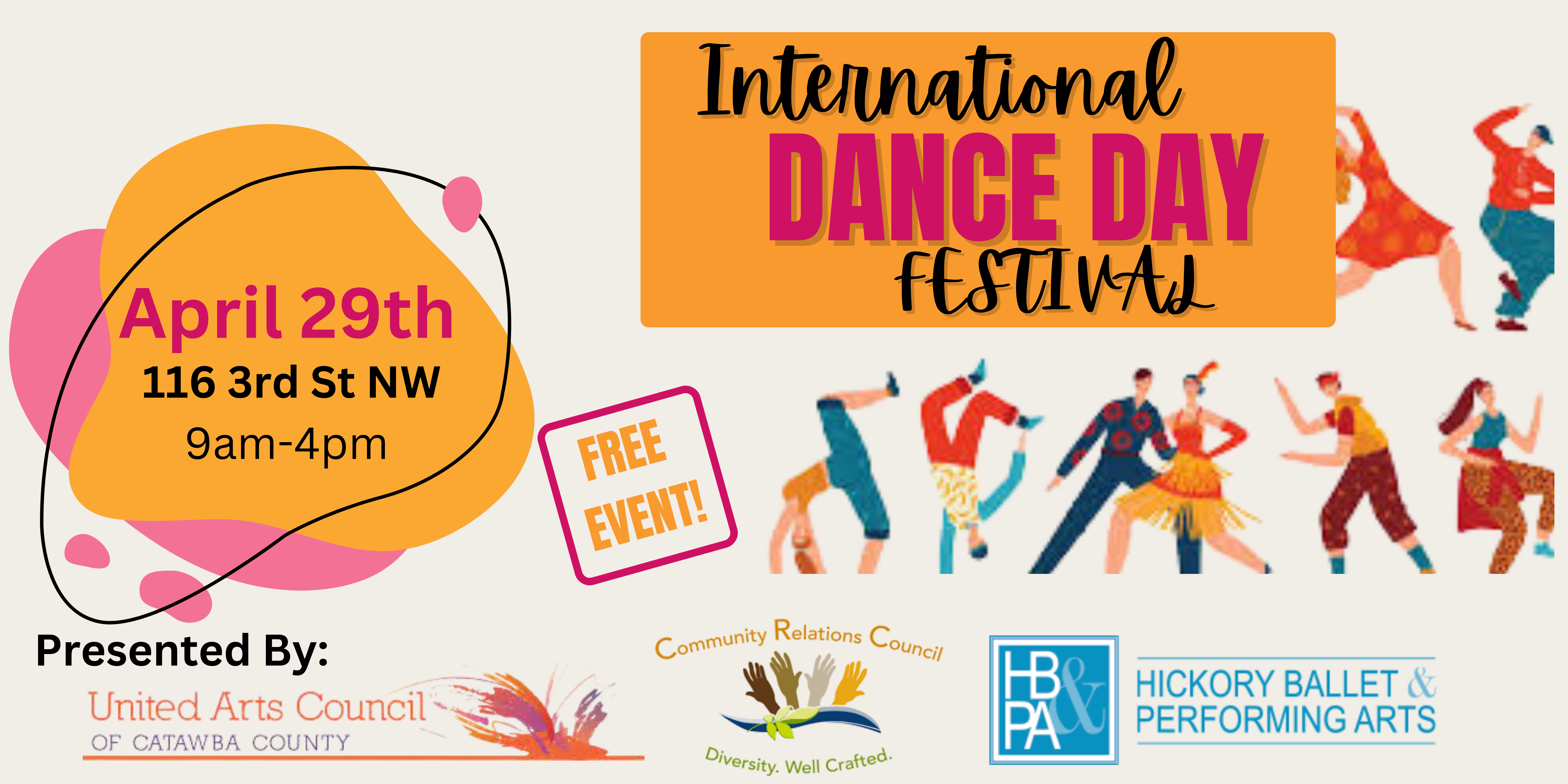 Come celebrate International Dance Day with Hickory Ballet and Performing Arts! This community event will showcase several dance styles in a day long festival of master classes! Everyone welcome, no dance experience necessary.