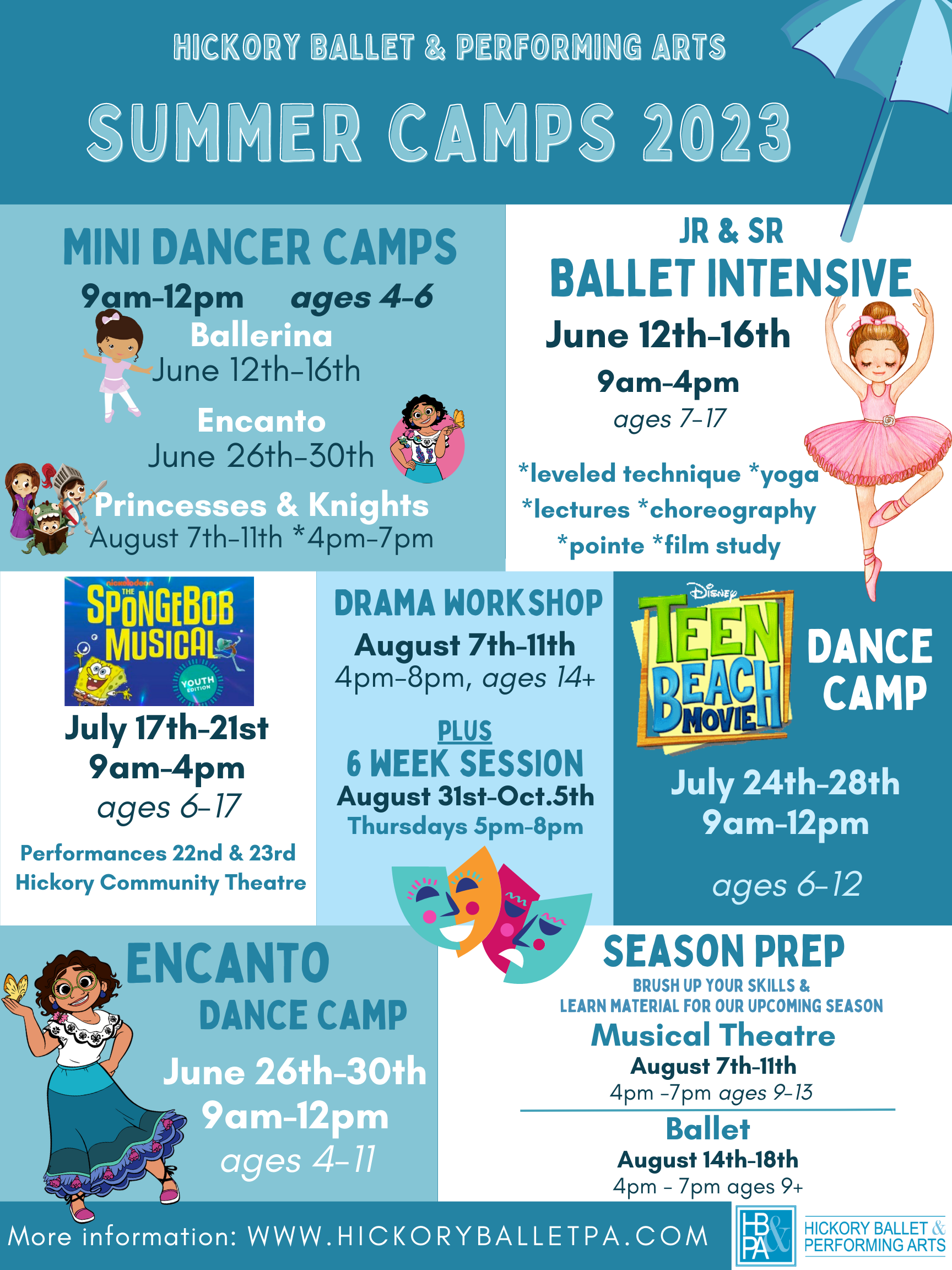 Encanto camp (Mini Dancers 4-6 years old) 9am-noon: Inspired by the music and characters of the Encanto movie, this camp will be a week full of dancing and singing to our favorite soundtrack. We’ll enjoy crafts and games as we find the magic inside of each of us!