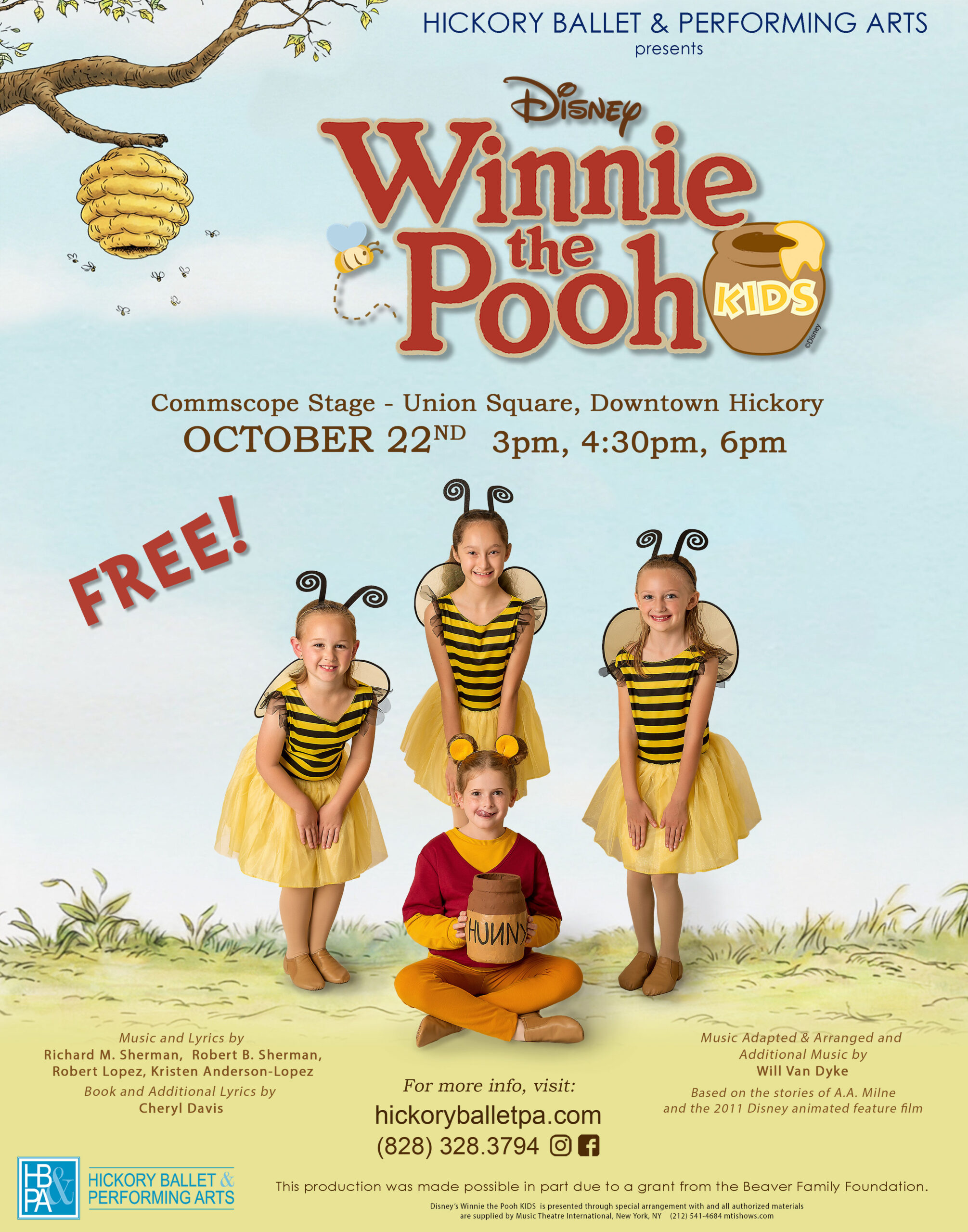 Winnie the Pooh Kids Join us for this fun musical based on the famous children’s novel. Date: October 22nd Time: 3:00pm, 4:30pm, 6:00pm Location: Commscope Stage (Under the Sails, Hickory’s Union Square) Cost: FREE!
